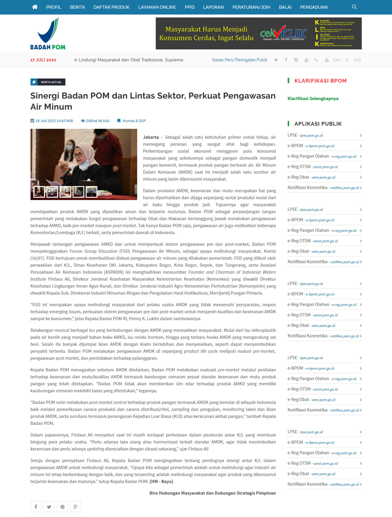 Jakarta – Sebagai salah satu kebutuhan primer untuk hidup, air memegang peranan yang sangat vital bagi kehidupan. Perkembangan sosial ekonomi menggeser pola konsumsi masyarakat yang sebelumnya sebagai pangan domestik menjadi pangan komersil, termasuk produk pangan berbasis air. Air Minum Dalam Kemasan (AMDK) saat ini menjadi salah satu sumber air minum yang lazim dikonsumsi masyarakat. Dalam produksi AMDK, keamanan dan mutu merupakan hal yang harus diperhatikan dan dijaga sepanjang rantai produksi mulai dari air baku hingga produk jadi. Tujuannya agar masyarakat mendapatkan produk AMDK yang dipastikan aman dan terjamin mutunya. Badan POM sebagai perpanjangan tangan pemerintah yang melakukan fungsi pengawasan terhadap Obat dan Makanan bertanggung jawab melakukan pengawasan terhadap AMKD, baik pre-market maupun post-market. Tak hanya Badan POM saja, pengawasan air juga melibatkan beberapa Kementerian/Lembaga (K/L) terkait, serta pemerintah daerah di Indonesia. Menjawab tantangan pengawasan AMKD dan untuk memperkuat sistem pengawasan pre dan post-market, Badan POM menyelenggarakan Forum Group Discusion (FGD) Pengawasan Air Minum, sebagai upaya melindungi masyarakat, Kamis (16/07). FGD bertujuan untuk memfasilitasi diskusi pengawasan air minum yang dilakukan pemerintah. FGD yang diikuti oleh perwakilan dari K/L, Dinas Kesehatan DKI Jakarta, Kabupaten Bogor, Kota Bogor, Depok, dan Tangerang, serta Asosiasi Perusahaan Air Kemasan Indonesia (ASPADIN) ini menghadirkan narasumber Founder and Chairman of Indonesia Waters Institute Firdaus Ali, Direktur Jenderal Kesehatan Masyarakat Kementerian Kesehatan (Kemenkes) yang diwakili Direktur Kesehatan Lingkungan Imran Agus Nurali, dan Direktur Jenderal Industri Agro Kementerian Perindustrian (Kemenperin) yang diwakili Kepala Sub. Direktorat Industri Minuman Ringan dan Pengolahan Hasil Holtikultura, Merrijantij Pungan Pintaria. “FGD ini merupakan upaya melindungi masyarakat dari pelaku usaha AMDK yang tidak memenuhi persyaratan, respon terhadap emerging issues, perkuatan sistem pengawasan pre dan post-market untuk menjamin kualitas dan keamanan AMDK sampai ke konsumen,” jelas Kepala Badan POM RI, Penny K. Lukito dalam sambutannya. Belakangan muncul berbagai isu yang berhubungan dengan AMDK yang meresahkan masyarakat. Mulai dari isu mikroplastik pada air bersih yang menjadi bahan baku AMKD, isu residu hormon, hingga yang terbaru hoaks AMDK yang mengandung zat besi. Selain itu banyak dijumpai iklan AMDK dengan klaim berlebihan dan menyesatkan, seperti dapat menyembuhkan penyakit tertentu. Badan POM melakukan pengawasan AMDK di sepanjang product life cycle meliputi evalusi pre-market, pengawasan post market, dan penindakan terhadap pelanggaran. Kepala Badan POM menegaskan sebelum AMDK diedarkan, Badan POM melakukan evaluasi pre-market melalui penilaian terhadap keamanan dan mutu/kualitas AMDK termasuk kandungan cemaran sesuai standar keamanan dan mutu produk pangan yang telah ditetapkan. ”Badan POM tidak akan memberikan izin edar terhadap produk AMKD yang memiliki kandunngan cemaran melebihi batas yang ditentukan," tegasnya. “Badan POM rutin melakukan post-market control terhadap produk pangan termasuk AMDK yang beredar di wilayah Indonesia baik melalui pemeriksaan sarana produksi dan sarana distribusi/ritel, sampling dan pengujian, monitoring label dan iklan produk AMDK, serta survilans termasuk penanganan Kejadian Luar Biasa (KLB) atau keracunan akibat pangan,” tambah Kepala Badan POM. Dalam paparannya, Firdaus Ali menyebut saat ini masih terdapat perbedaan dalam peraturan antar K/L yang membuat bingung para pelaku usaha. “Perlu adanya tata ulang atau harmonisasi terkait standar AMDK, agar tidak menimbulkan kerancuan dan perlu adanya updating disesuaikan dengan situasi sekarang,” ujar Firdaus Ali Setuju dengan pernyataan Firdaus Ali, Kepala Badan POM mengingatkan tentang pentingnya sinergi antar K/L dalam pengawasan AMDK untuk melindungi masyarakat. “Upaya kita sebagai pemerintah adalah untuk melindungi agar industri air minum ini tetap berkembang dengan baik, dan yang terpenting adalah melindungi masyarakat agar produk yang dikonsumsi terjamin keamanan dan mutunya.” tutup Kepala Badan POM. (HM - Bayu) Biro Hubungan Masyarakat dan Dukungan Strategis Pimpinan Sumber: Badan POM